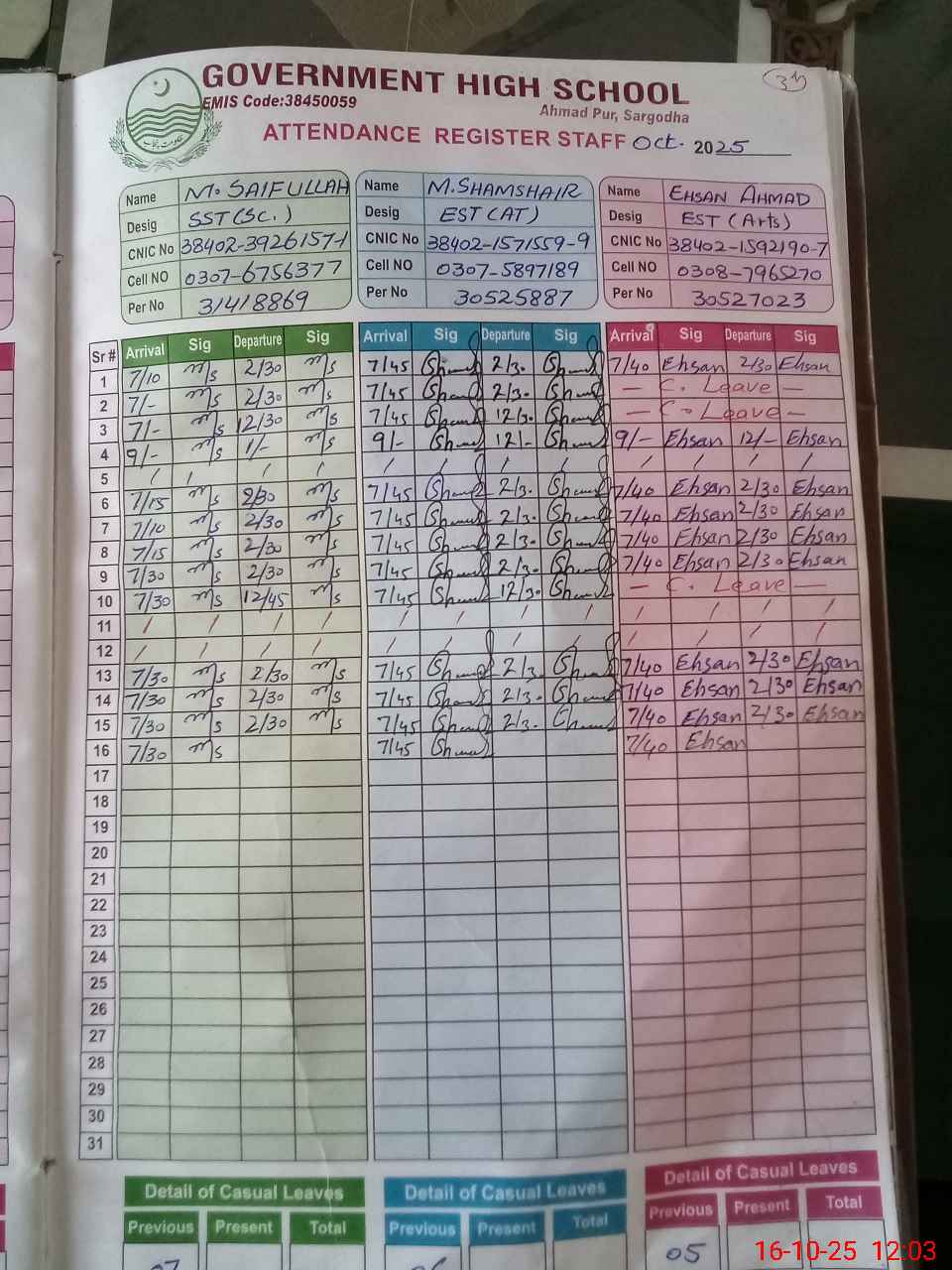 | CNIC | Full Name | Designation | R/C | Absence during last cal. month |