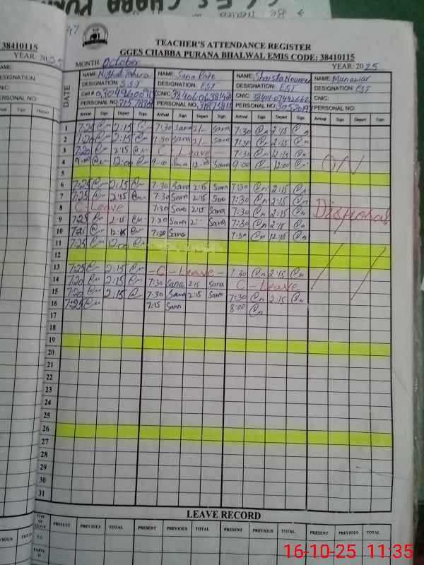 | CNIC | Full Name | Designation | R/C | Absence During Last Calender Month |