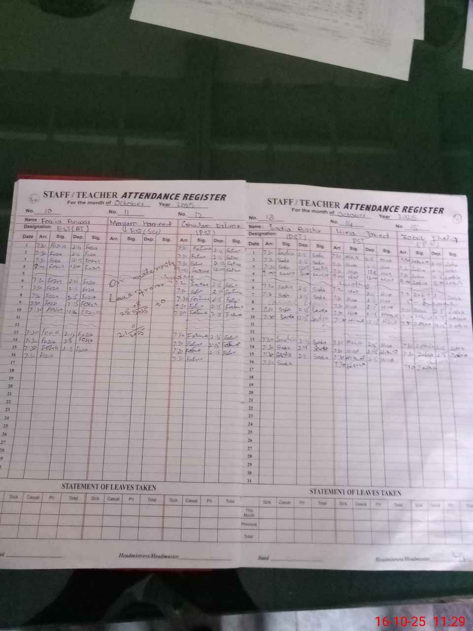 | Remarks (Use Separate Page if Required): As per attendance register teacher Maryum Hameed shown on Maternity leave but her leave approved record not provided for necessary action | |||||