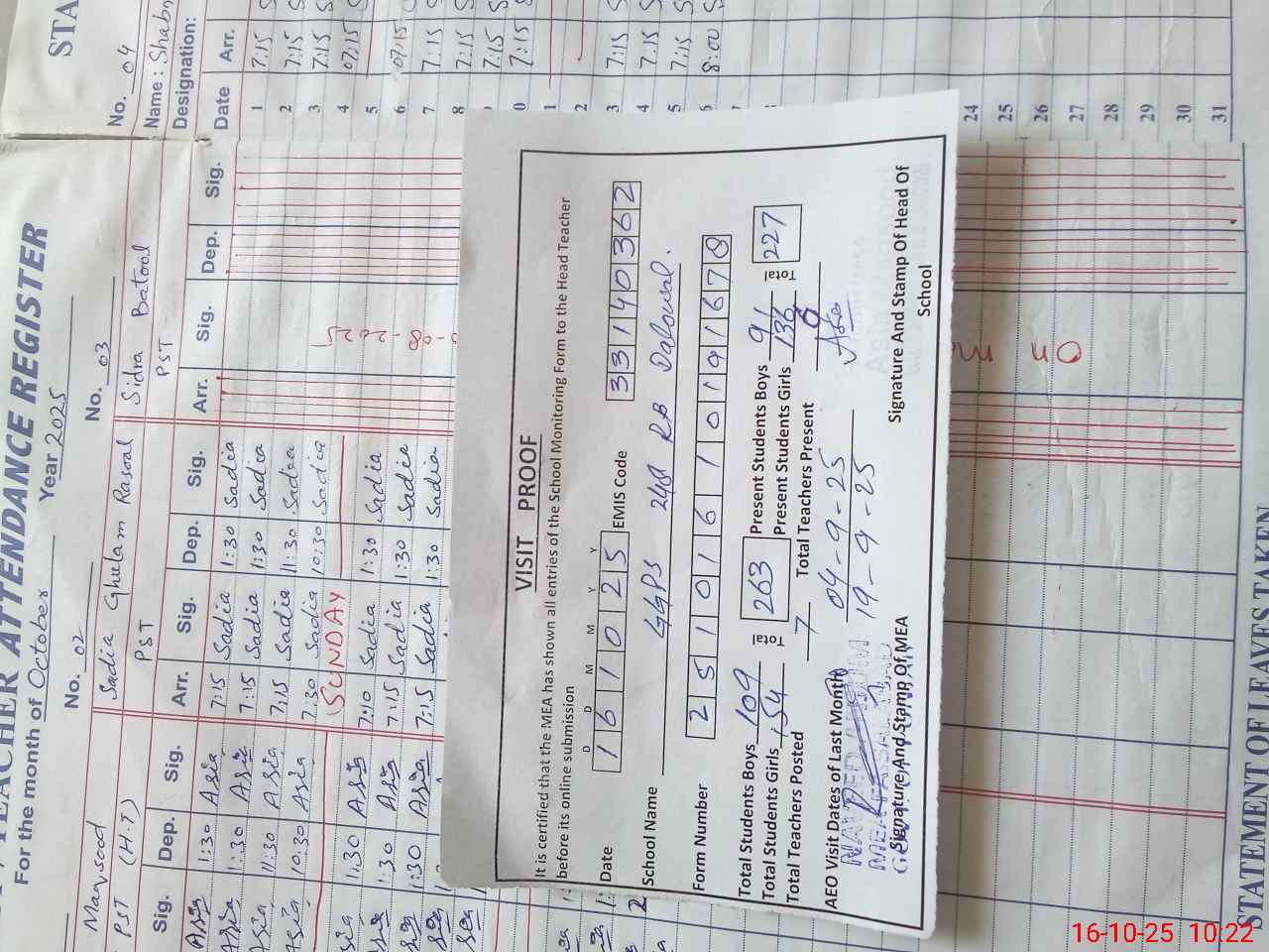| Attendance Register | Head Teacher | MEA with School | Visit Proof |