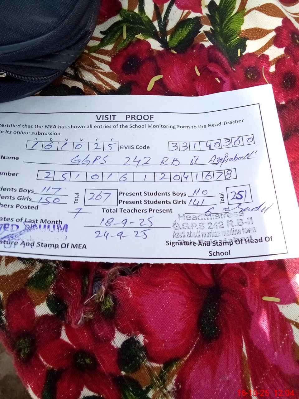 | Certified that this School was Inspected by the Undersigned MEA/DMO Today and the Information Stated Above is as Per Record. | |||||