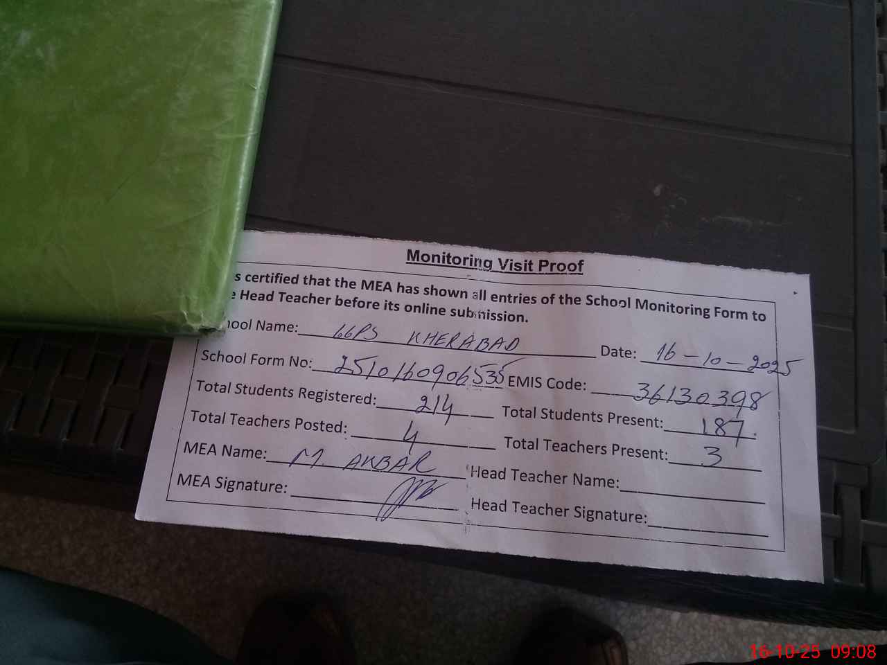 | Attendance Register | Head Teacher | MEA with School | Visit Proof |