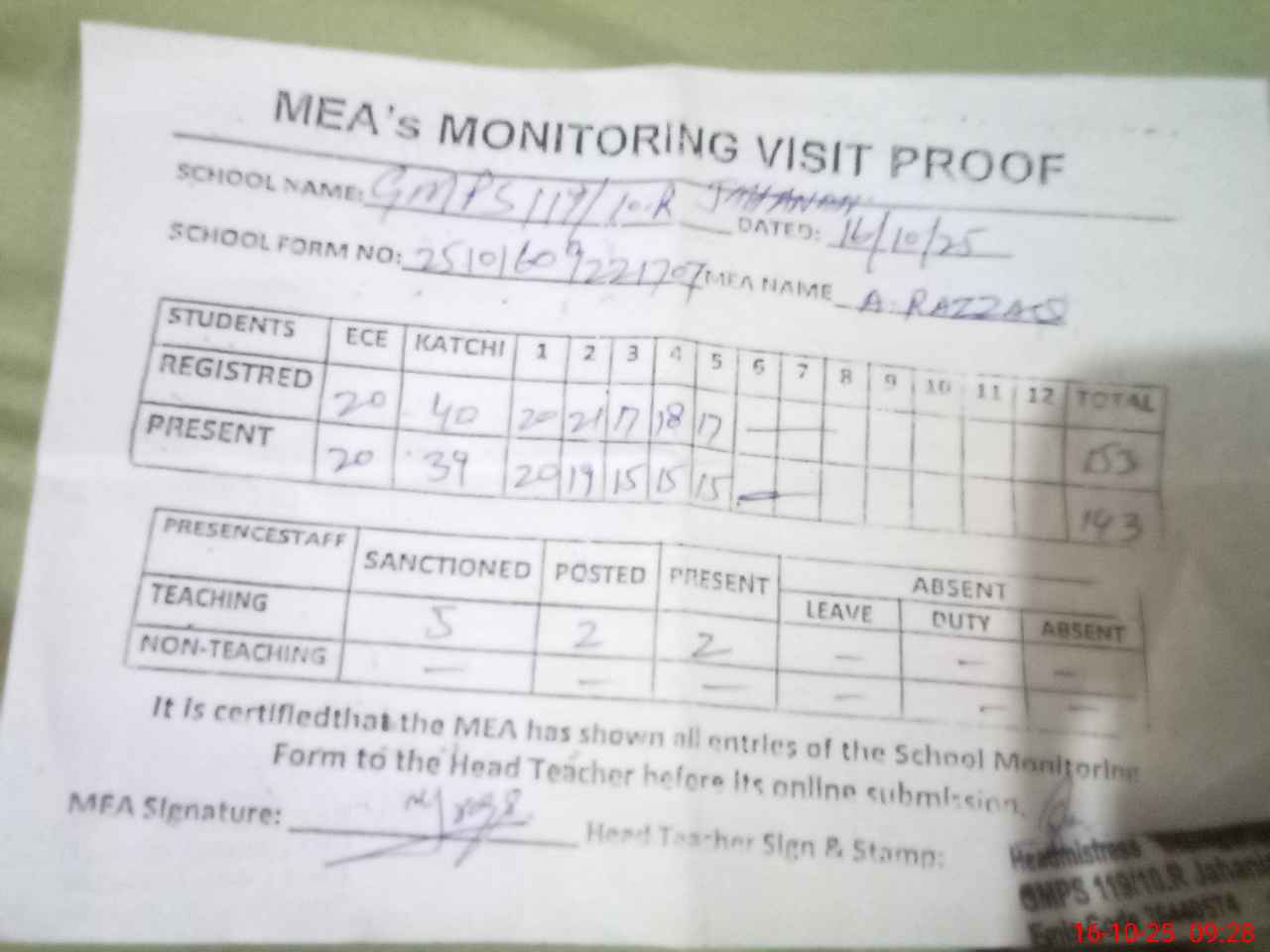 | Attendance Register | Head Teacher | MEA with School | Visit Proof |