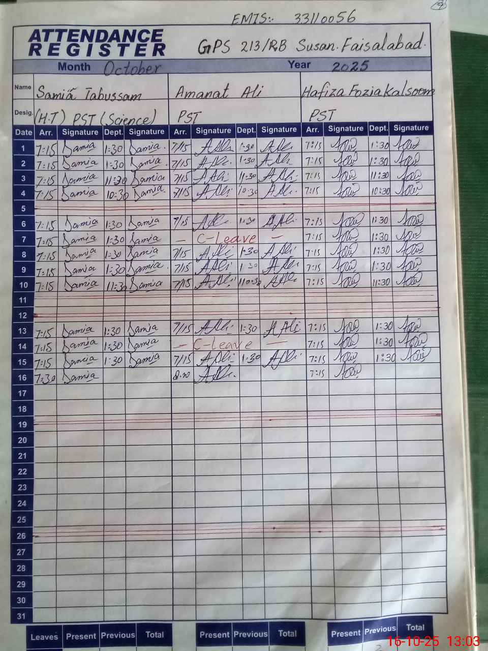 | CNIC | Full Name | Designation | R/C | Absence during last cal. month |