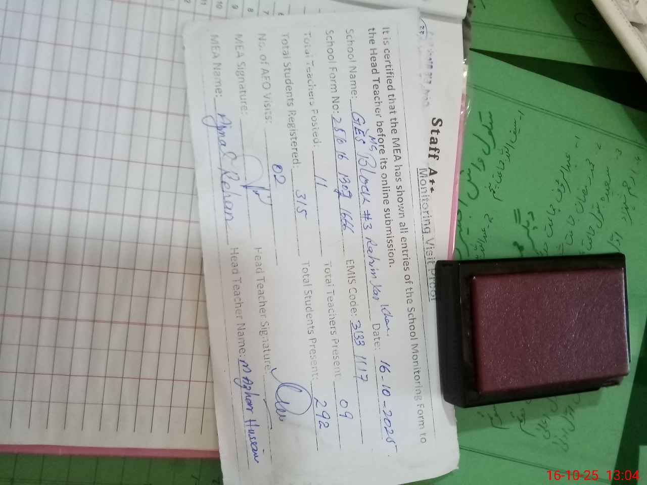 | Attendance Register | Head Teacher | MEA with School | Visit Proof |