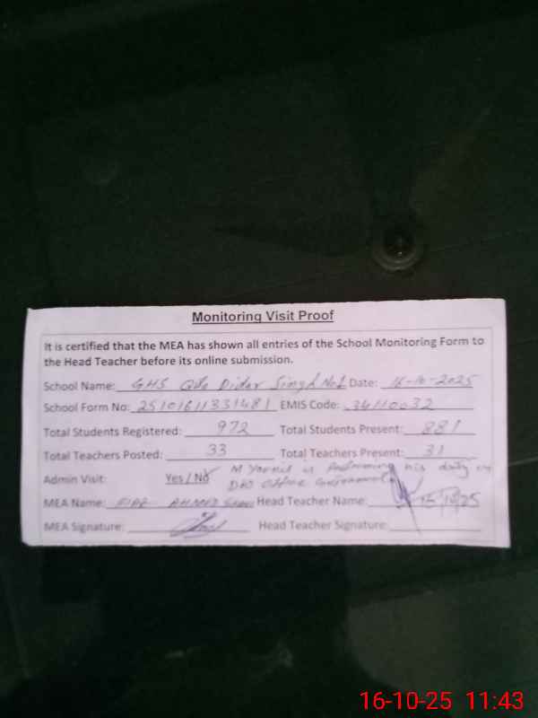 | EMIS Code: 34110032 | Name of School: GHS QILA DIDAR SINGH NO.1 | |||
