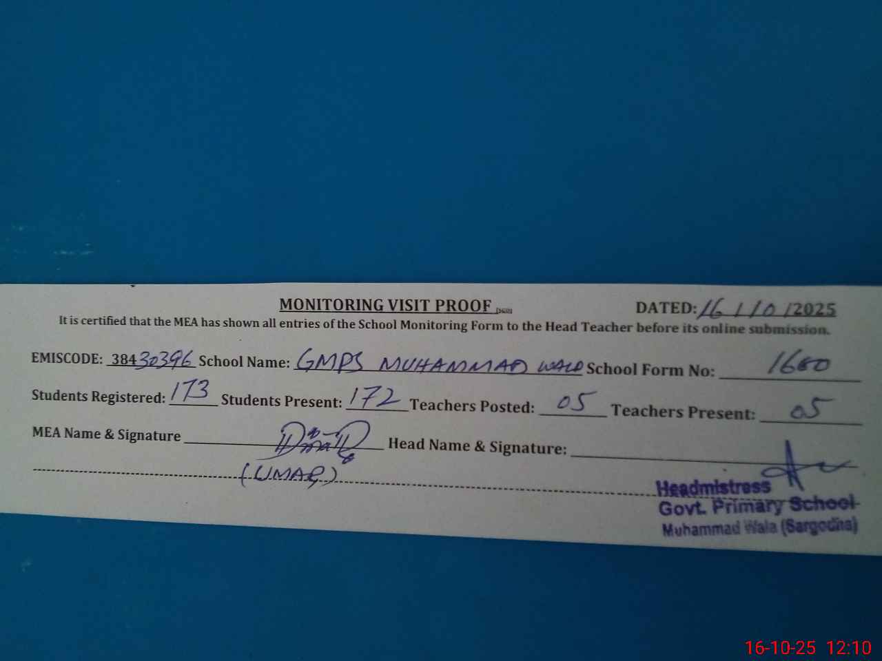 | Certified that this School was Inspected by the Undersigned MEA/DMO Today and the Information Stated Above is as Per Record. | |||||