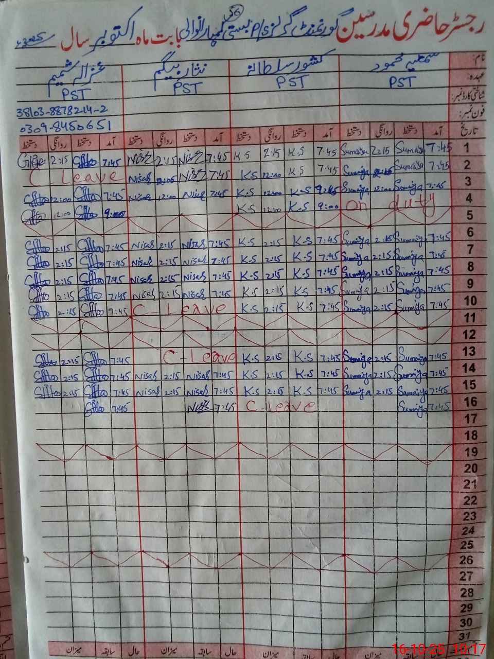 | CNIC | Full Name | Designation | R/C | Absence During Last Calender Month |