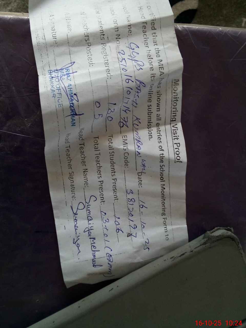 | Certified that this School was Inspected by the Undersigned MEA/DMO Today and the Information Stated Above is as Per Record. | |||||