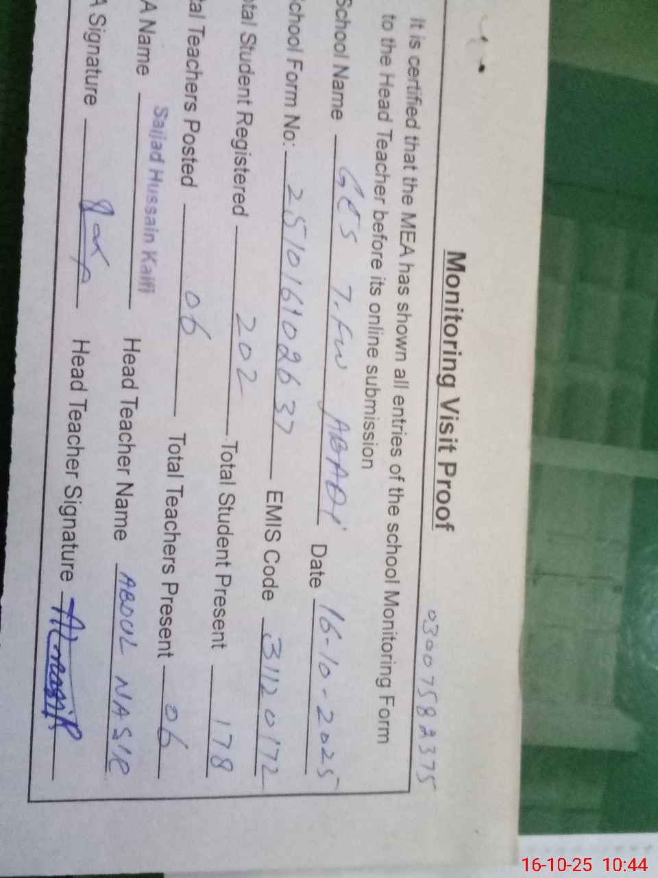 | Name: AB**** NA**** Designation: (School Headmaster's/Headmistress's) EST G Phone/Cell Number: 03**** |