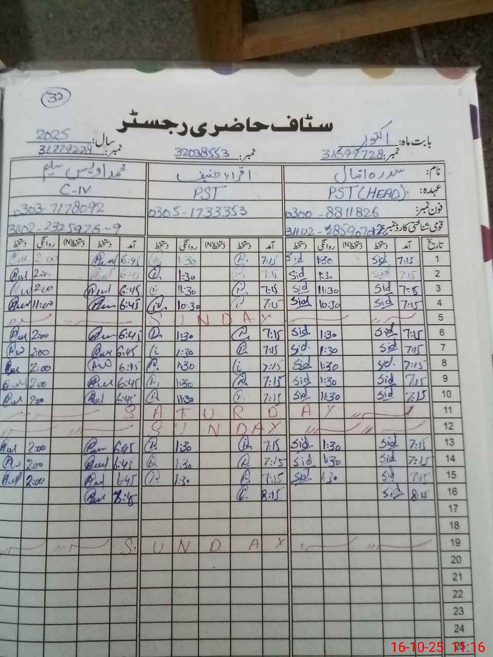 | CNIC | Full Name | Designation | R/C | Absence during last cal. month |
