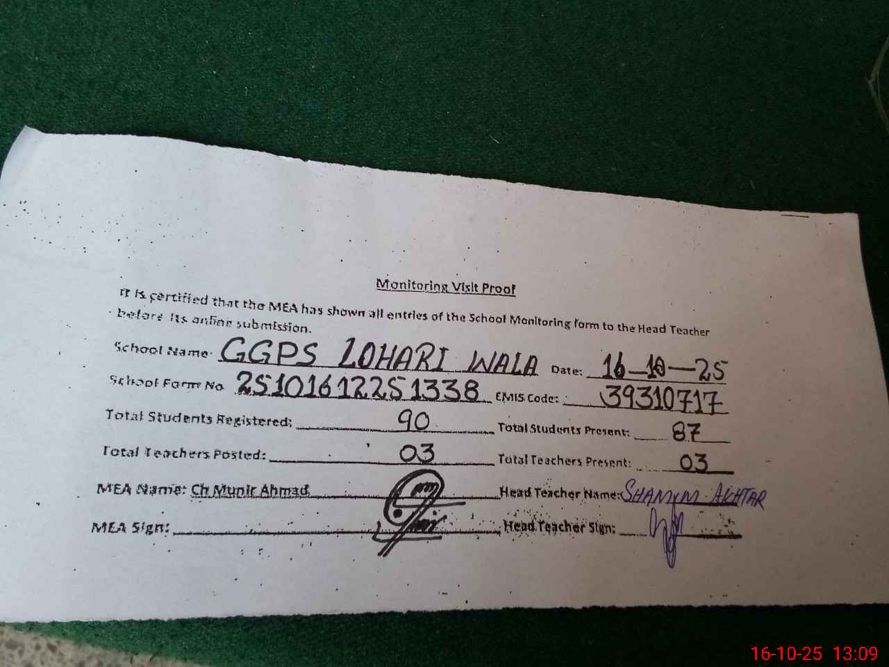 | Attendance Register | Head Teacher | MEA with School | Visit Proof |