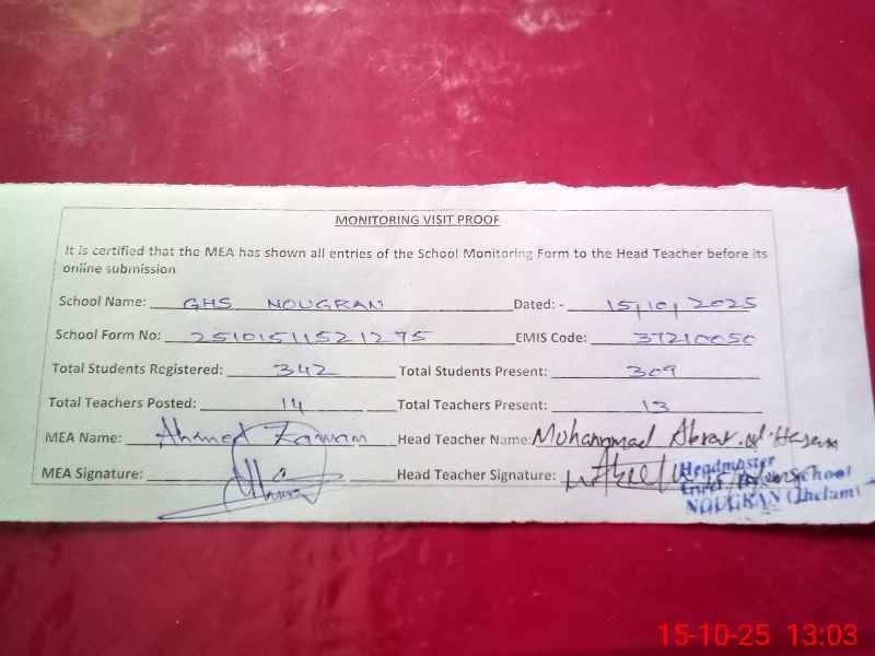 | Certified that this School was Inspected by the Undersigned MEA/DMO Today and the Information Stated Above is as Per Record. | |||||