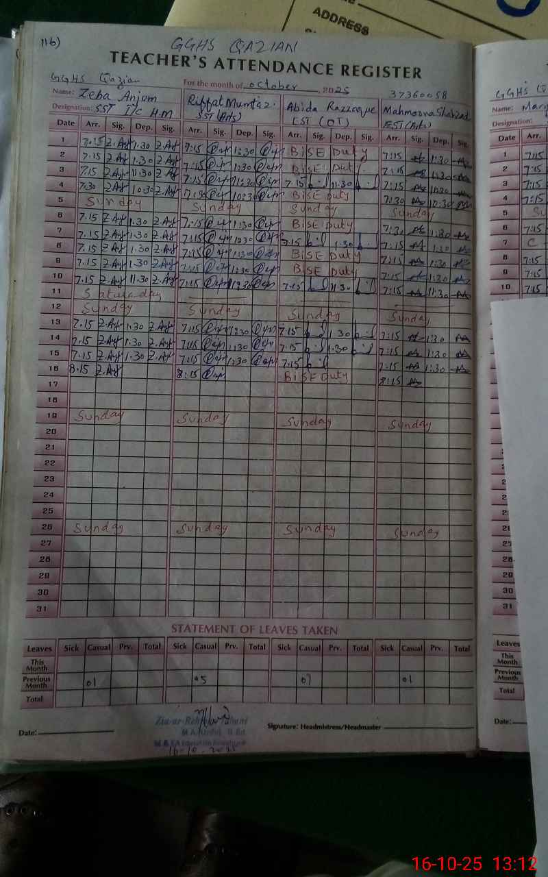 | 37**** | Ab**** Ru**** | Regular | 1 | 1 | 0 | 0 | 0 | 0 | 0 | 0 | 1 | Exam Duty | |