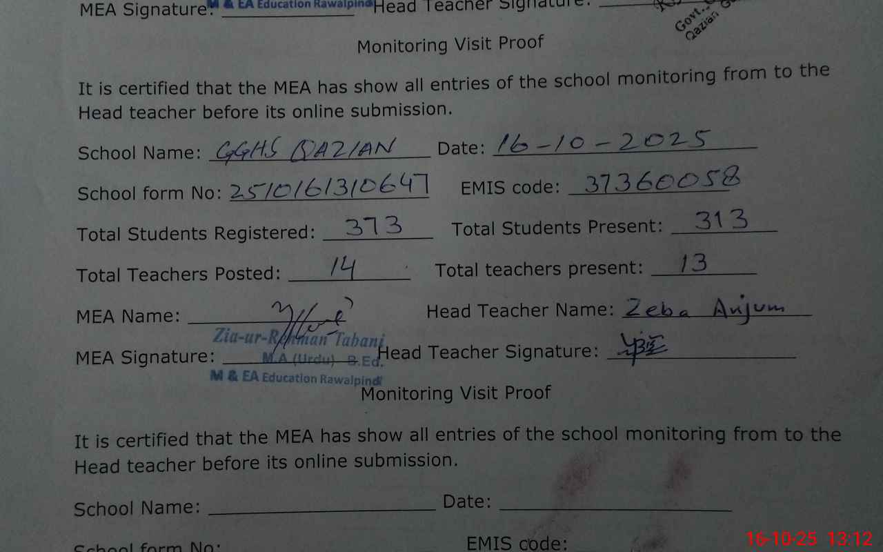 | EMIS Code: 37360058 | Name of School: GGHS QAZIAN | |||