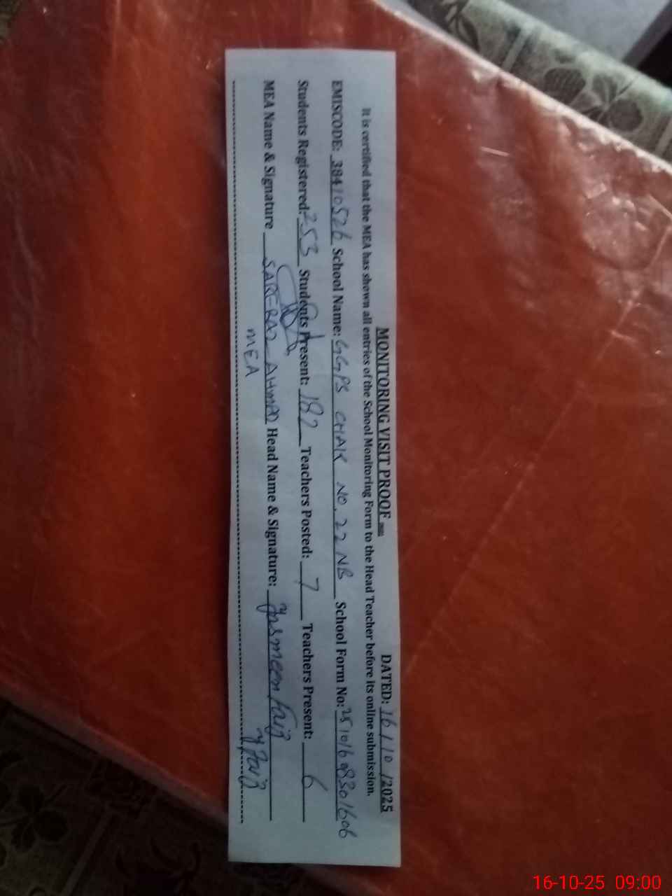 | Certified that this School was Inspected by the Undersigned MEA/DMO Today and the Information Stated Above is as Per Record. | |||||