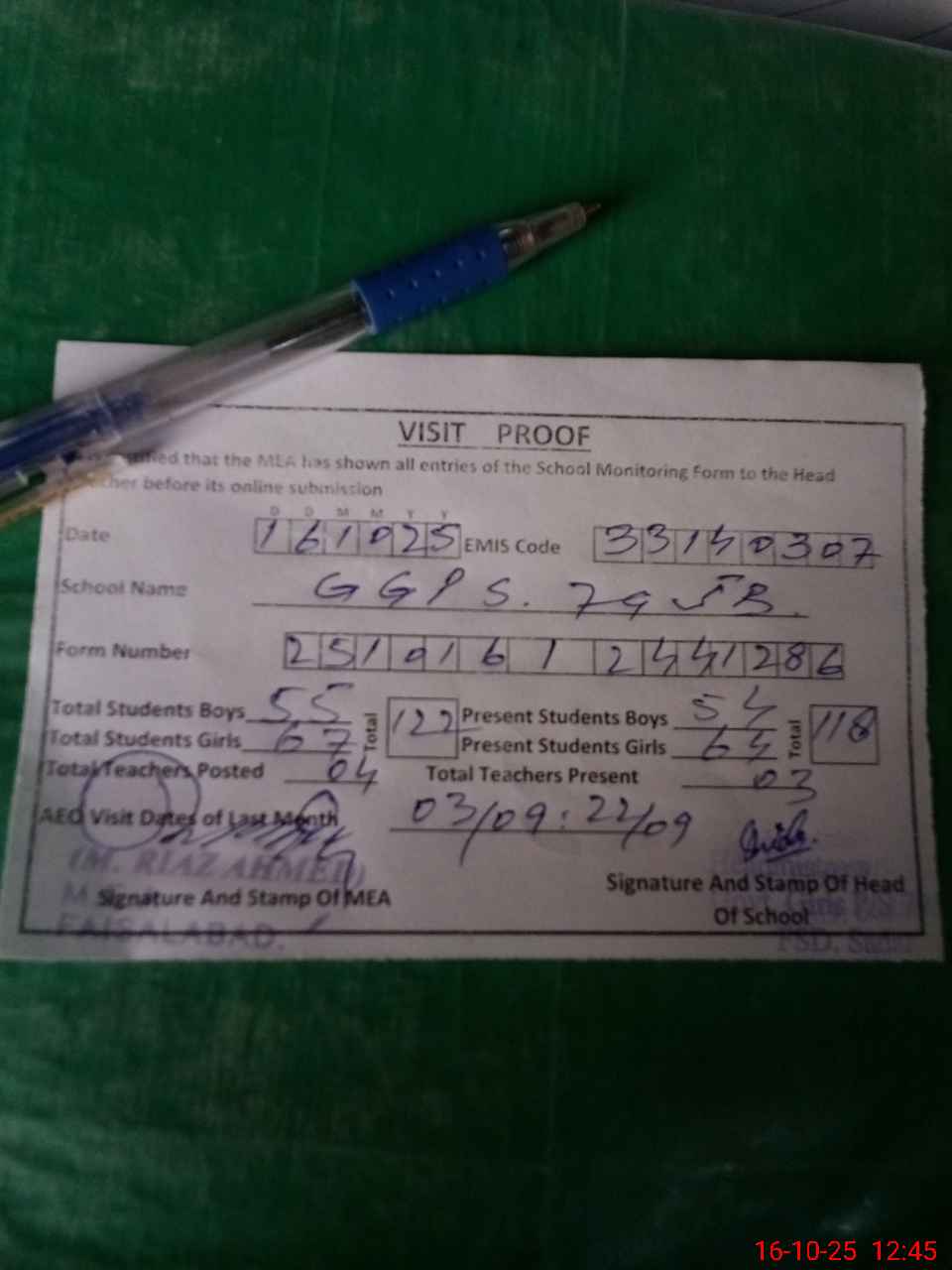 | EMIS Code: 33140307 | Name of School: GGPS CHAK NO 79 JB | |||