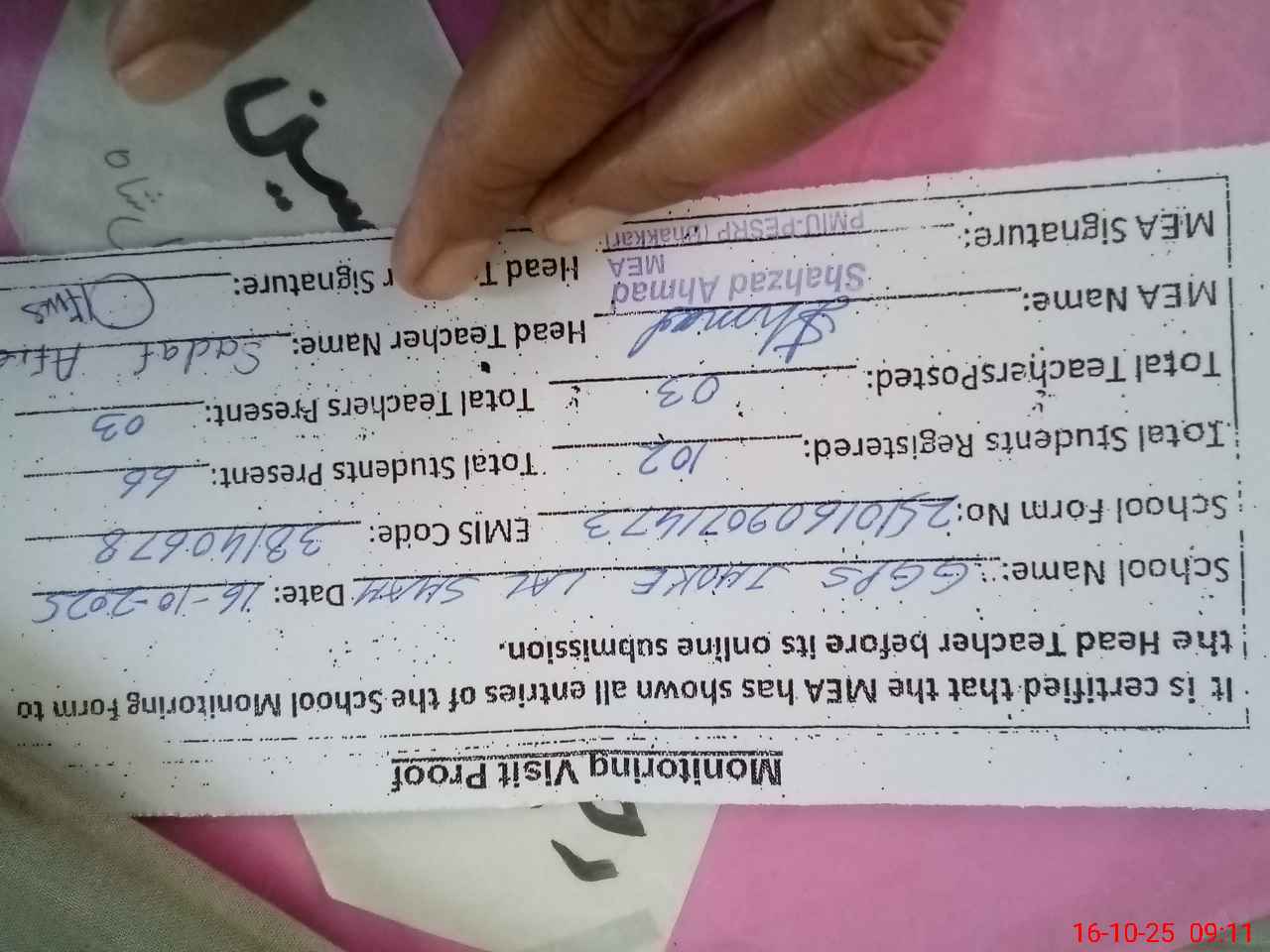 | Certified that this School was Inspected by the Undersigned MEA/DMO Today and the Information Stated Above is as Per Record. | |||||