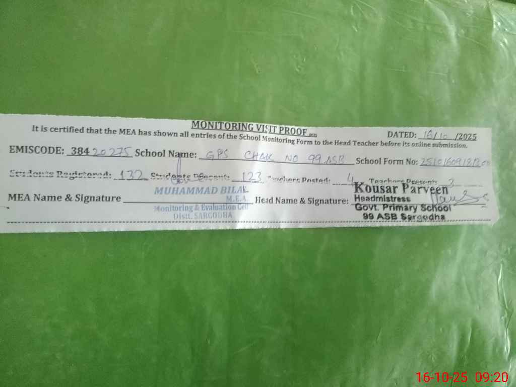 | EMIS Code: 38420275 | Name of School: GPS CHAK NO.99 A-SB | |||