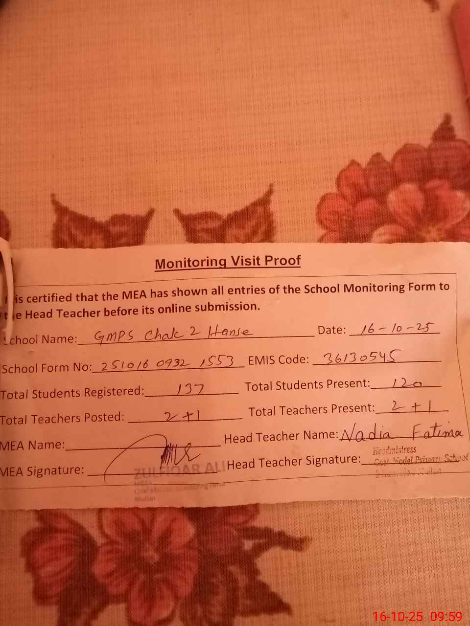 | Certified that this School was Inspected by the Undersigned MEA/DMO Today and the Information Stated Above is as Per Record. | |||||