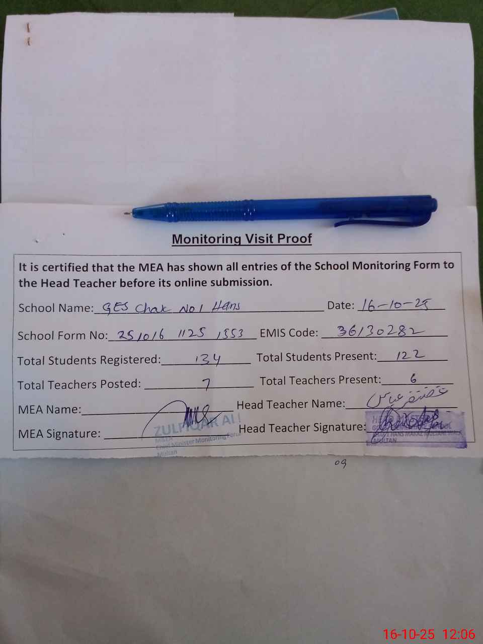 | EMIS Code: 36130282 | Name of School: GES CHAK NO.1 HANS P/O KOT MELA RAM | |||