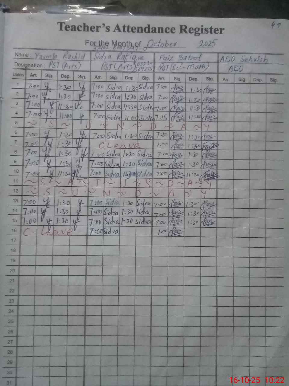 | CNIC | Full Name | Designation | R/C | Absence during last cal. month |