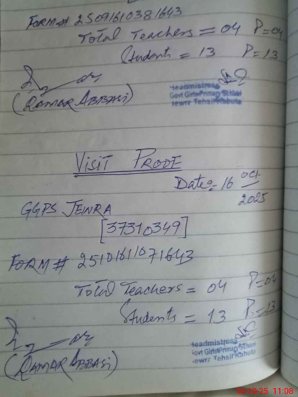 | Attendance Register | Head Teacher | MEA with School | Visit Proof |