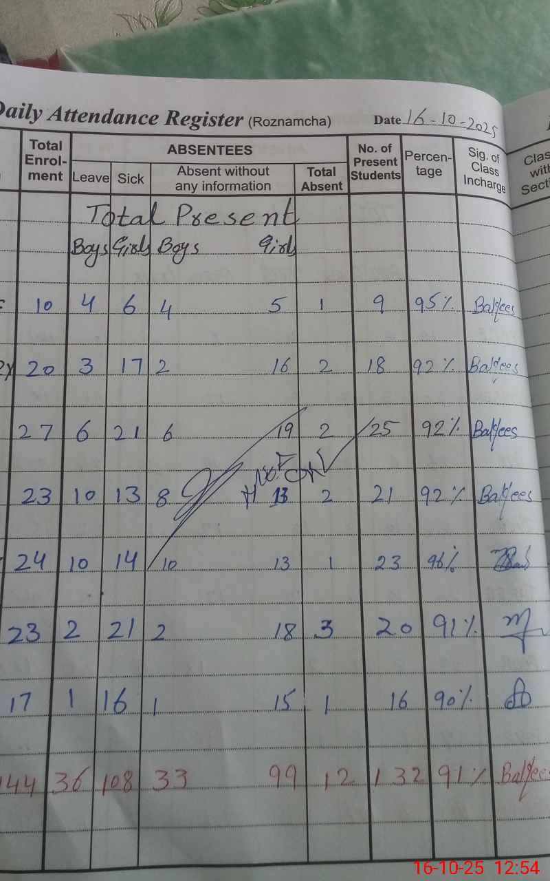 | No. of Students Present - Female | 5 | 0 | 16 | 19 | 11 | 13 | 18 | 15 | 44 | 45 | 50 | 38 | 28 | 302 | ||