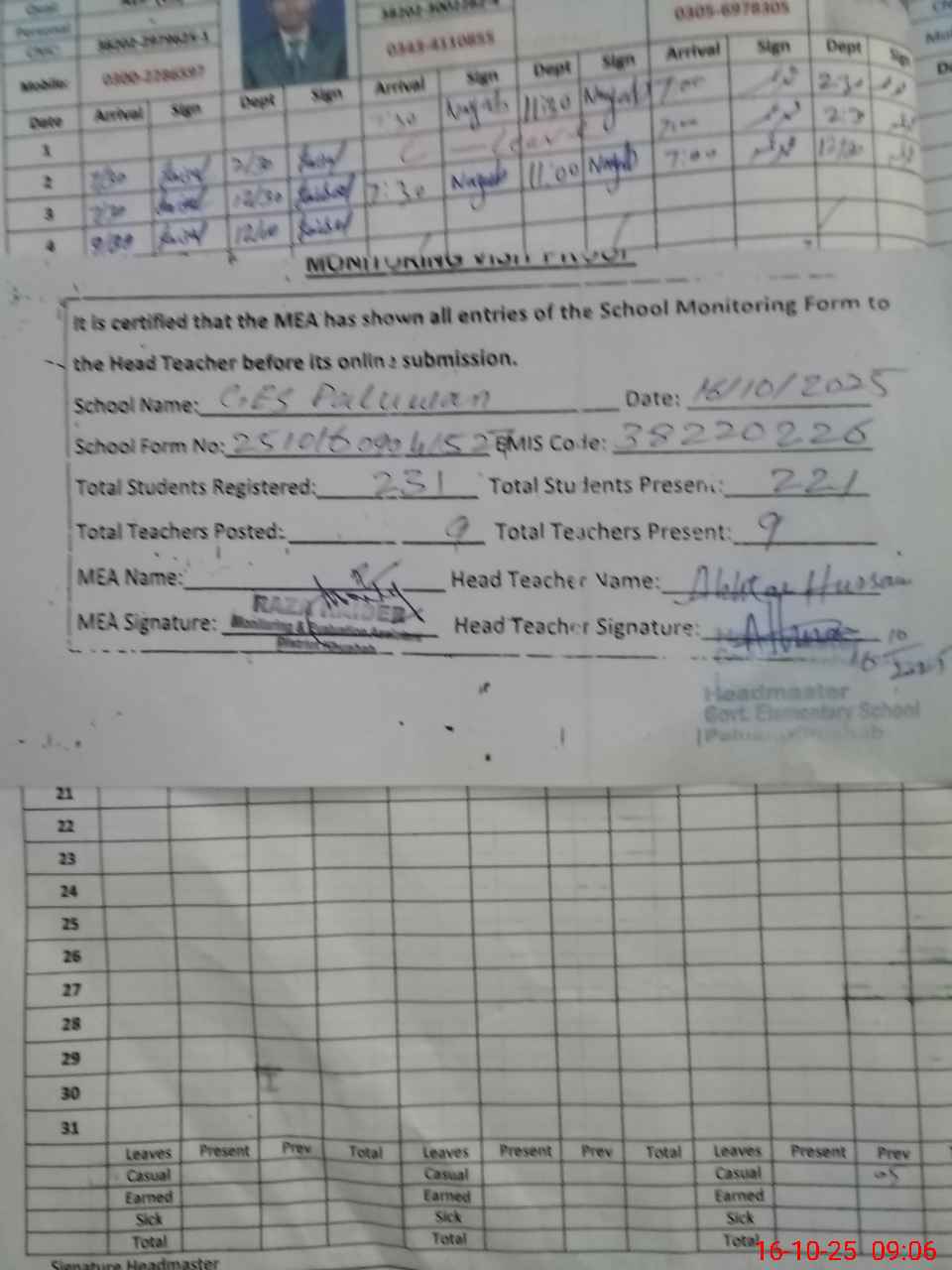 | Attendance Register | Head Teacher | MEA with School | Visit Proof |