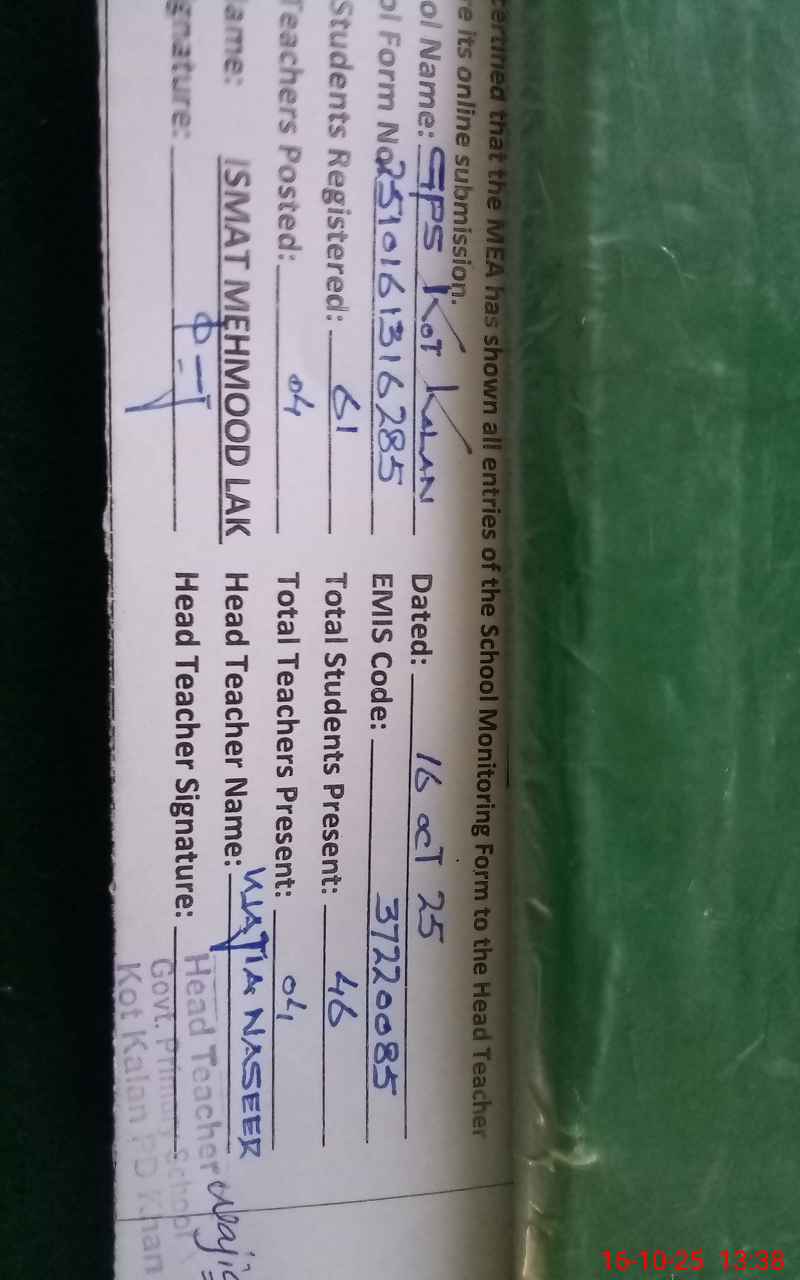 | EMIS Code: 37220085 | Name of School: GPS KOT KALAN | |||