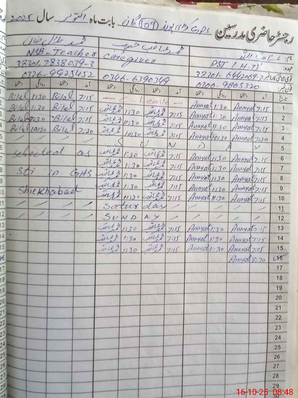 | CNIC | Full Name | Designation | R/C | Absence During Last Calender Month |