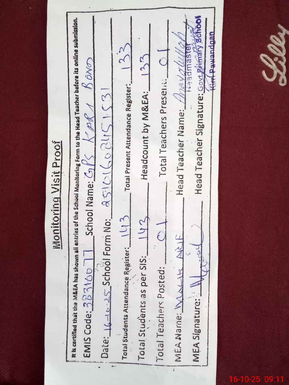 | Attendance Register | Head Teacher | MEA with School | Visit Proof |