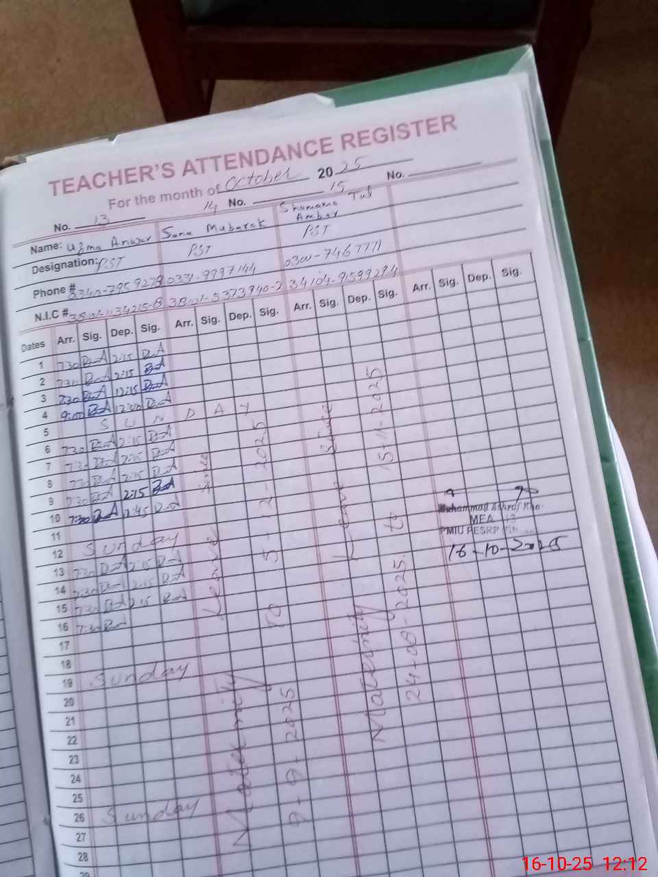 | Name: Sa**** Sa**** Designation: (School Headmaster's/Headmistress's) SST Phone/Cell Number: 03**** |