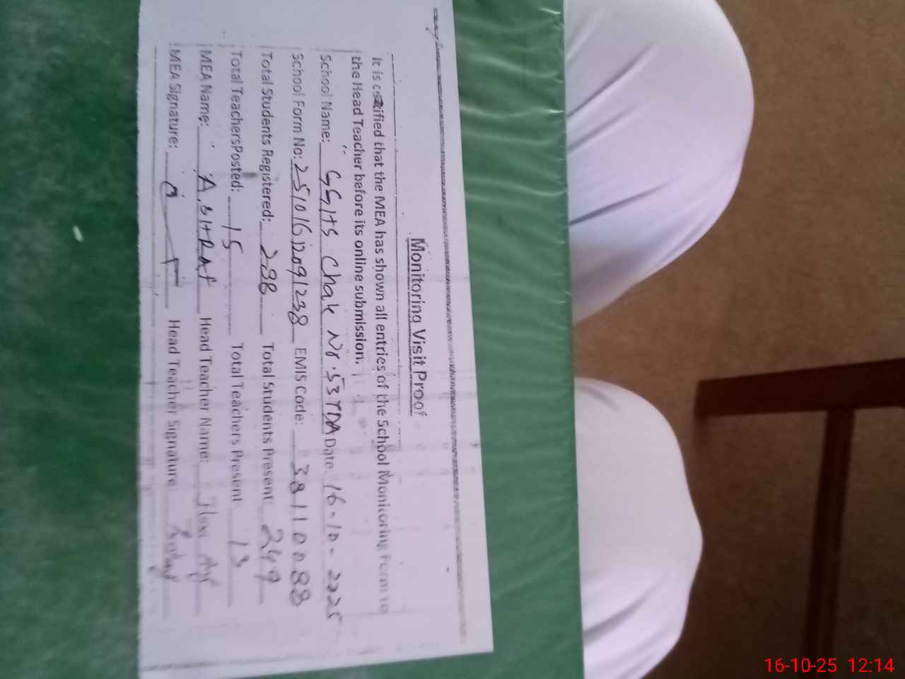 | Attendance Register | Head Teacher | MEA with School | Visit Proof |
