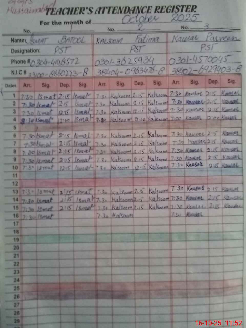 | Name: IS**** BA**** Designation: (School Headmaster's/Headmistress's) PST Phone/Cell Number: 03**** |