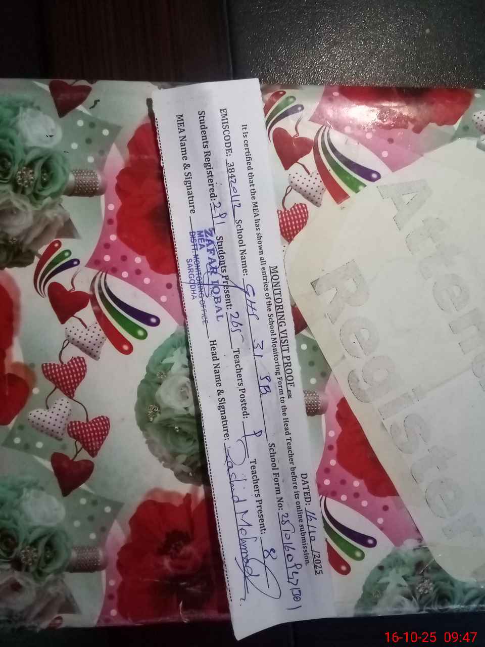 | Attendance Register | Head Teacher | MEA with School | Visit Proof |