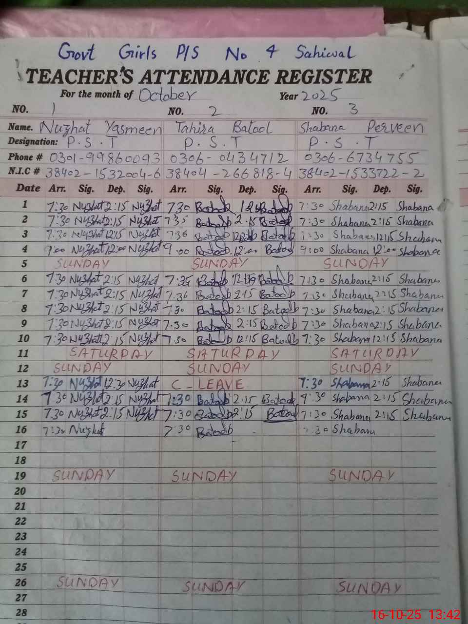 | CNIC | Full Name | Designation | R/C | Absence During Last Calender Month |