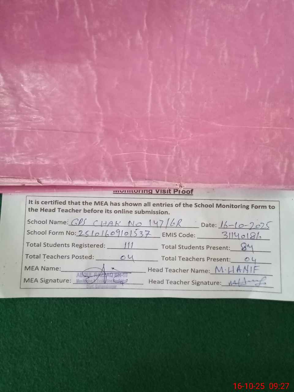 | EMIS Code: 31140186 | Name of School: GPS CHAK NO. 147/6-R | |||