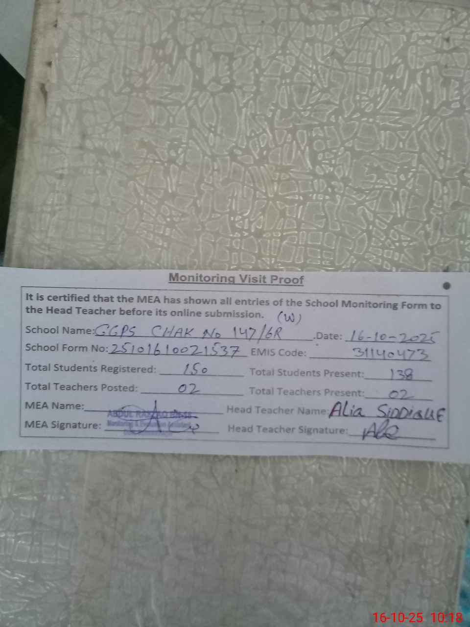 | Attendance Register | Head Teacher | MEA with School | Visit Proof |