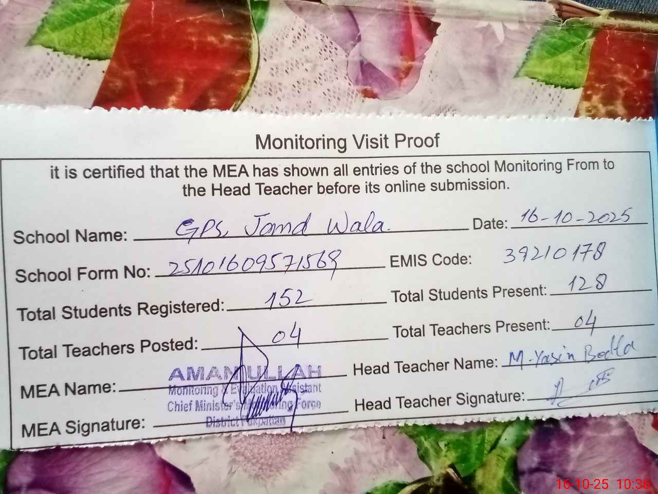 | Certified that this School was Inspected by the Undersigned MEA/DMO Today and the Information Stated Above is as Per Record. | |||||