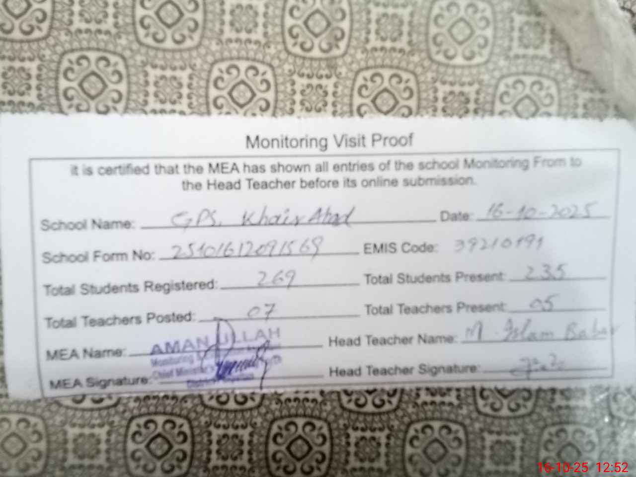 | Certified that this School was Inspected by the Undersigned MEA/DMO Today and the Information Stated Above is as Per Record. | |||||