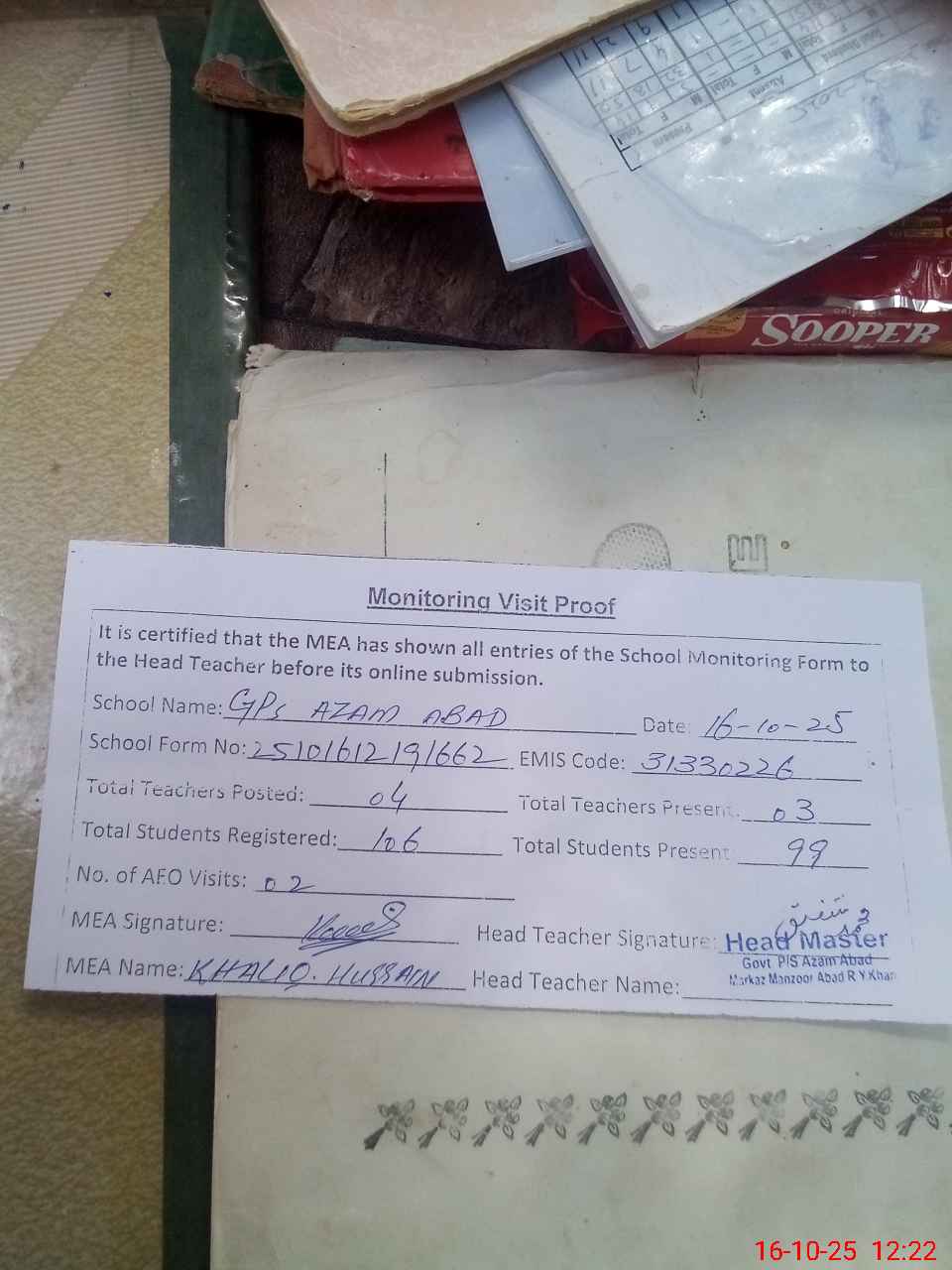 | Attendance Register | Head Teacher | MEA with School | Visit Proof |