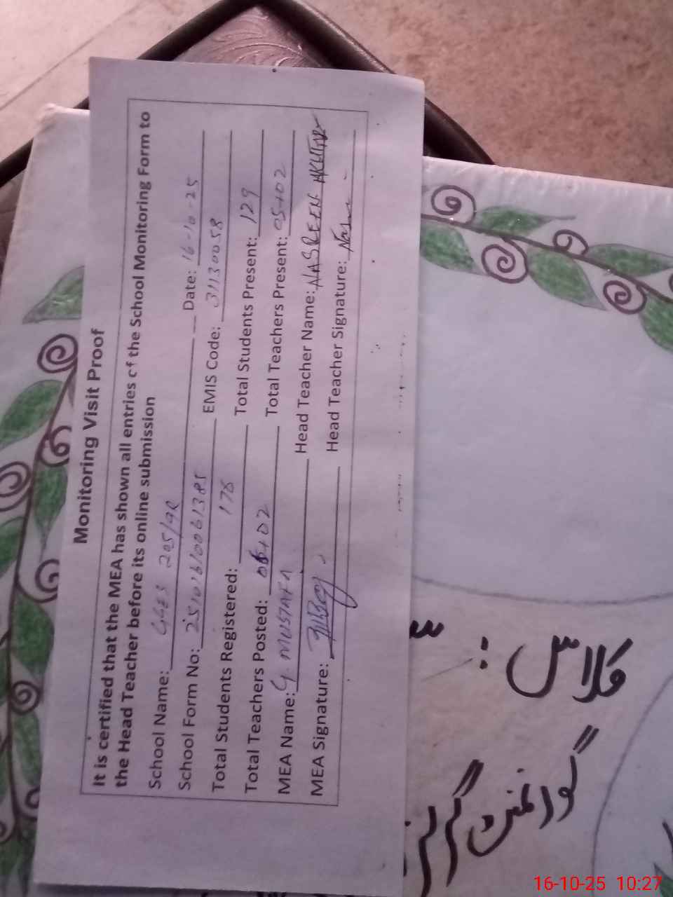 | Attendance Register | Head Teacher | MEA with School | Visit Proof |
