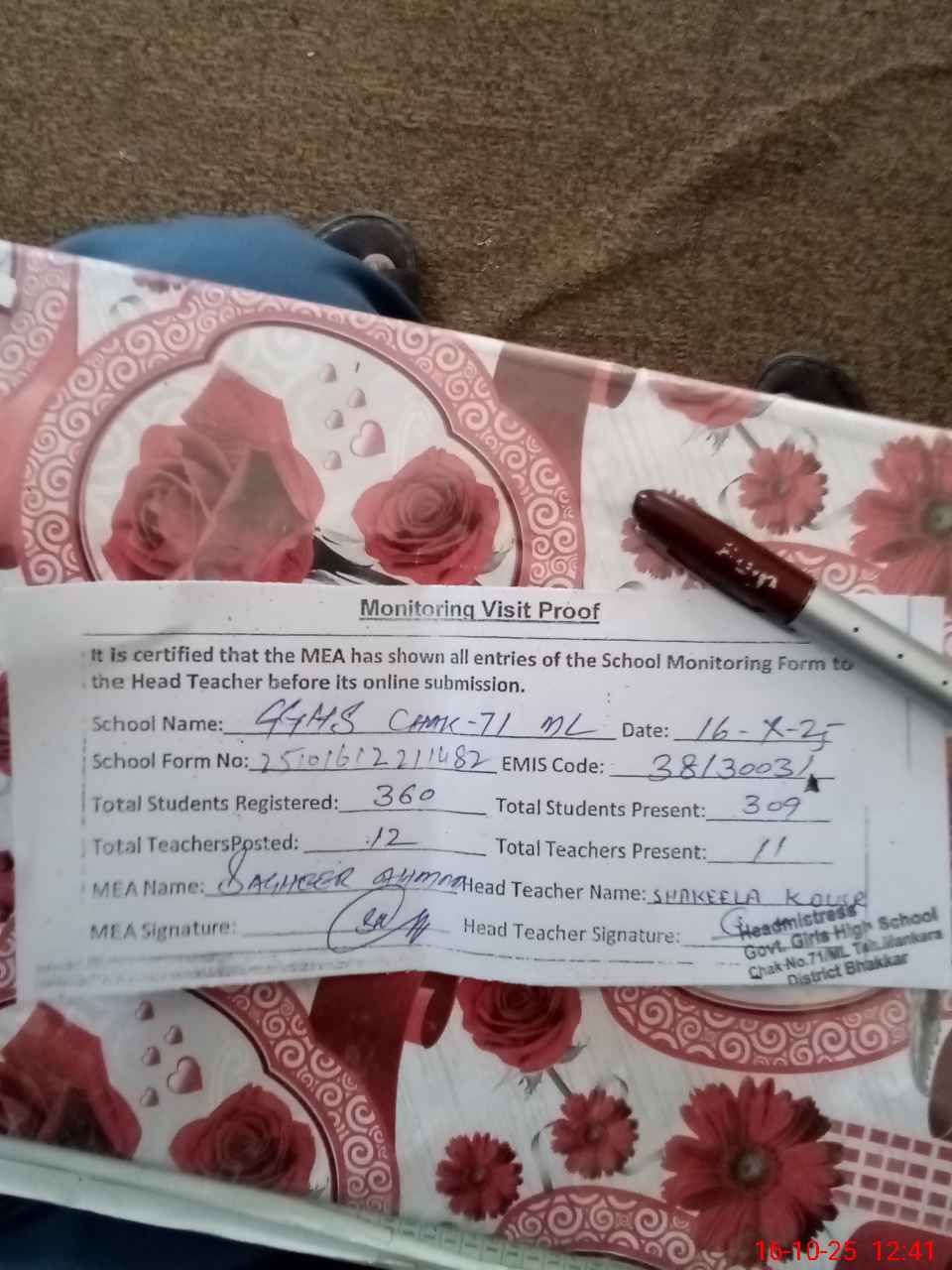 | Attendance Register | Head Teacher | MEA with School | Visit Proof |