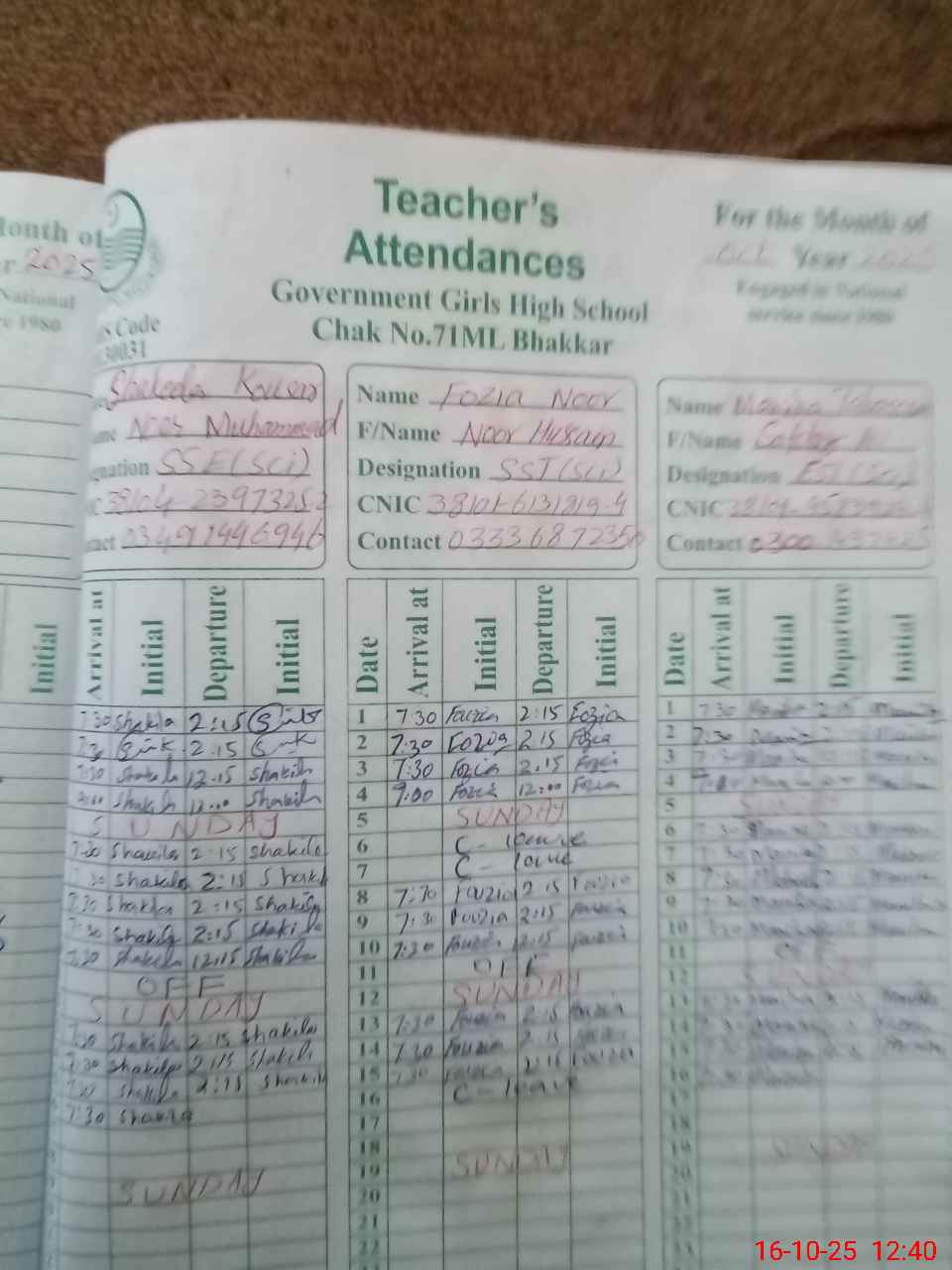 | CNIC | Full Name | Designation | R/C | Absence During Last Calender Month |