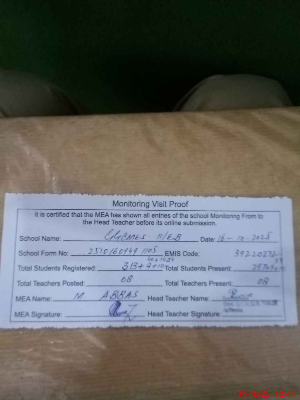 | Attendance Register | Head Teacher | MEA with School | Visit Proof |