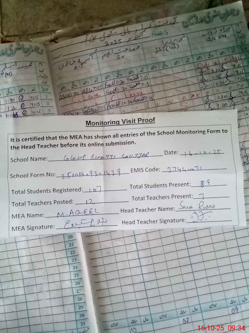 | Attendance Register | Head Teacher | MEA with School | Visit Proof |