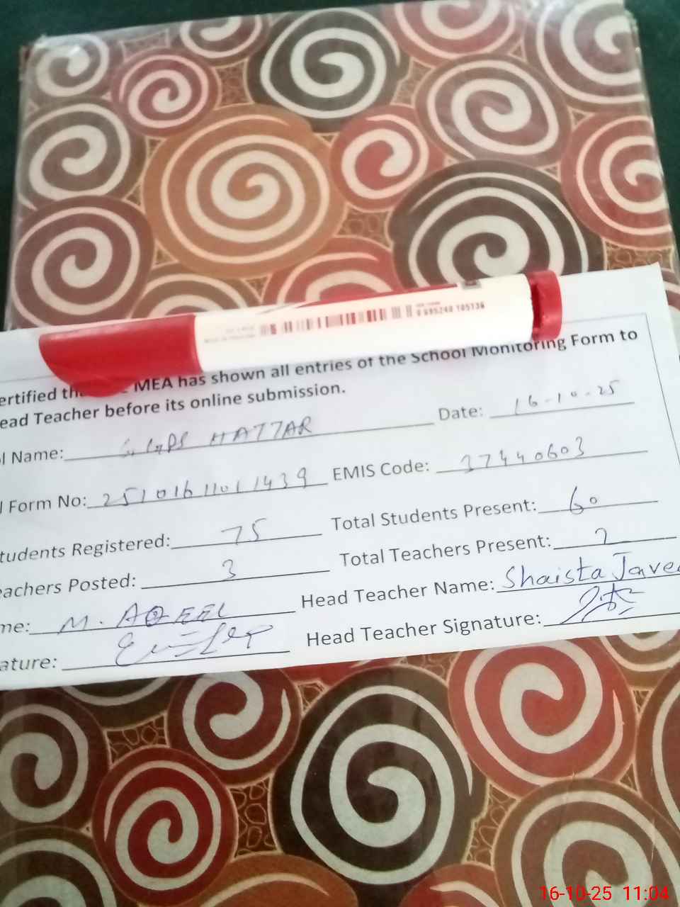 | Attendance Register | Head Teacher | MEA with School | Visit Proof |