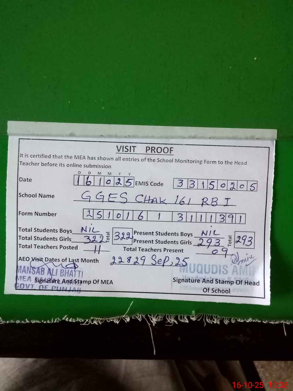 | EMIS Code: 33150205 | Name of School: GGES CHAK 161 RB-I | |||