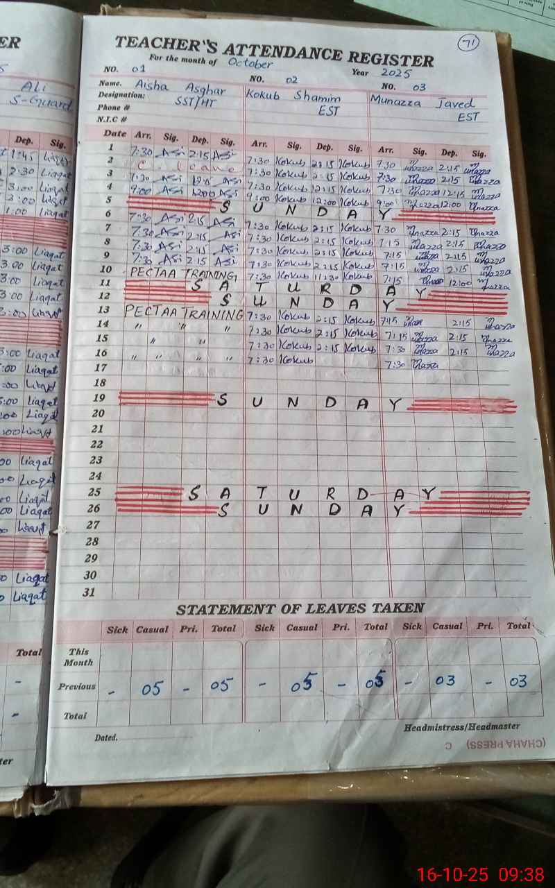 | Remarks (Use Separate Page if Required): Mostly classes students sitting 04 Students on One bench Broken chairs for teacher even in head teacher office Teacher Sania PST name not showing on PMIU APP list | |||||